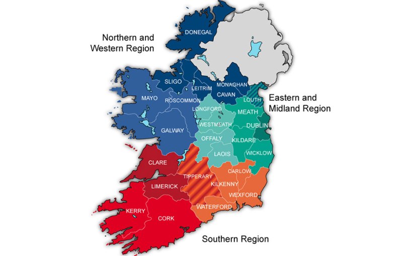 I was given an old, outdated and lo-res map of Irish regions and asked to recreate it hi-res for printing and with some graphical changes.